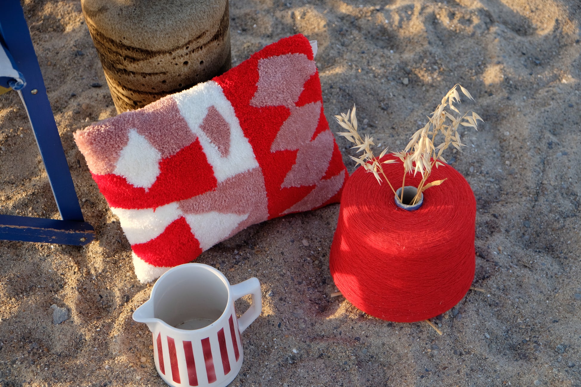 - Composition : Laine acrylique certifiée oeko-tex, toile de moine, velours, colle, chevrons en coton, étiquette numérotée