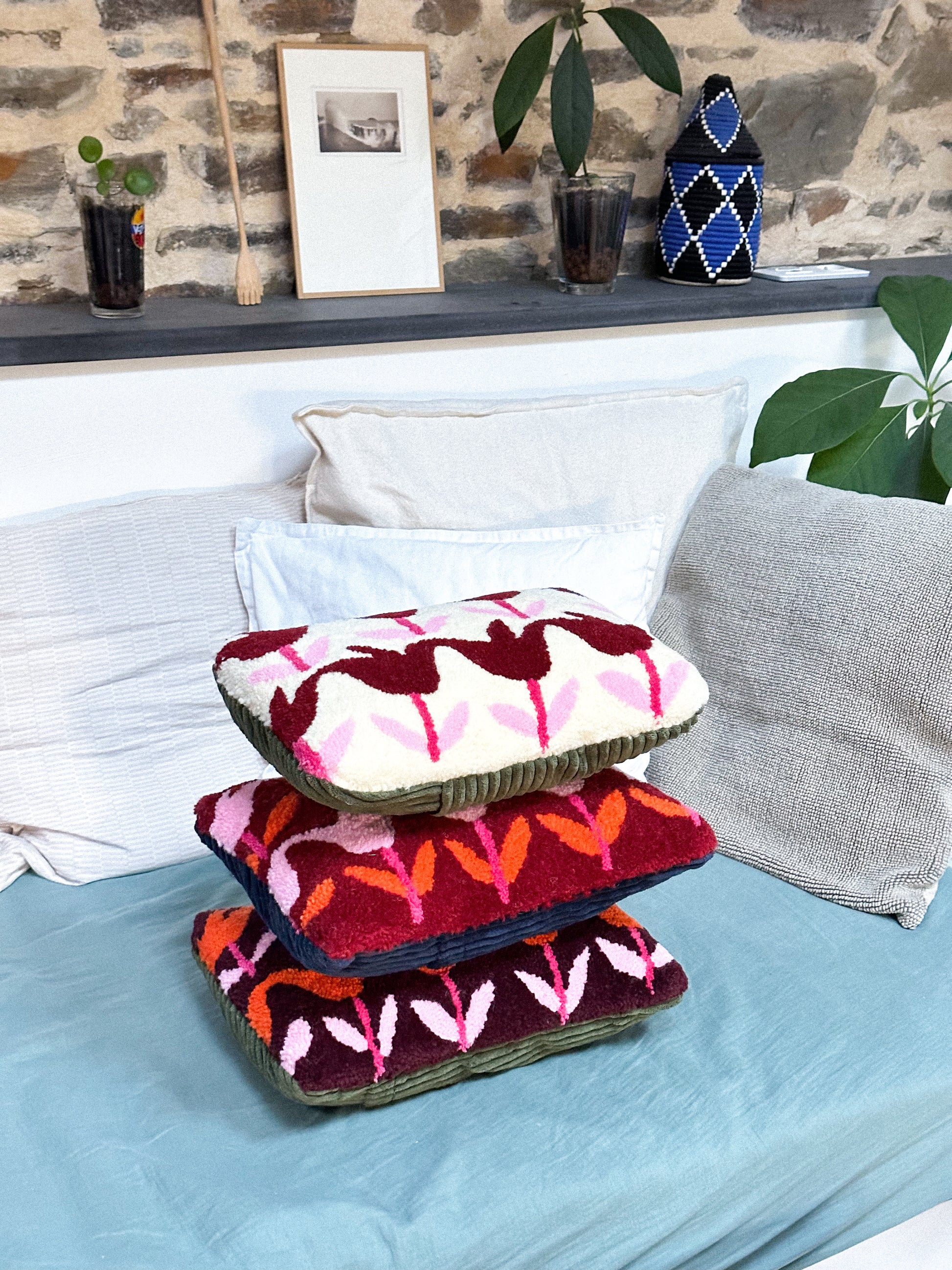 Coussin TULIPA PURPLE, pièce unique tuftée à la main à côté de Saint Malo